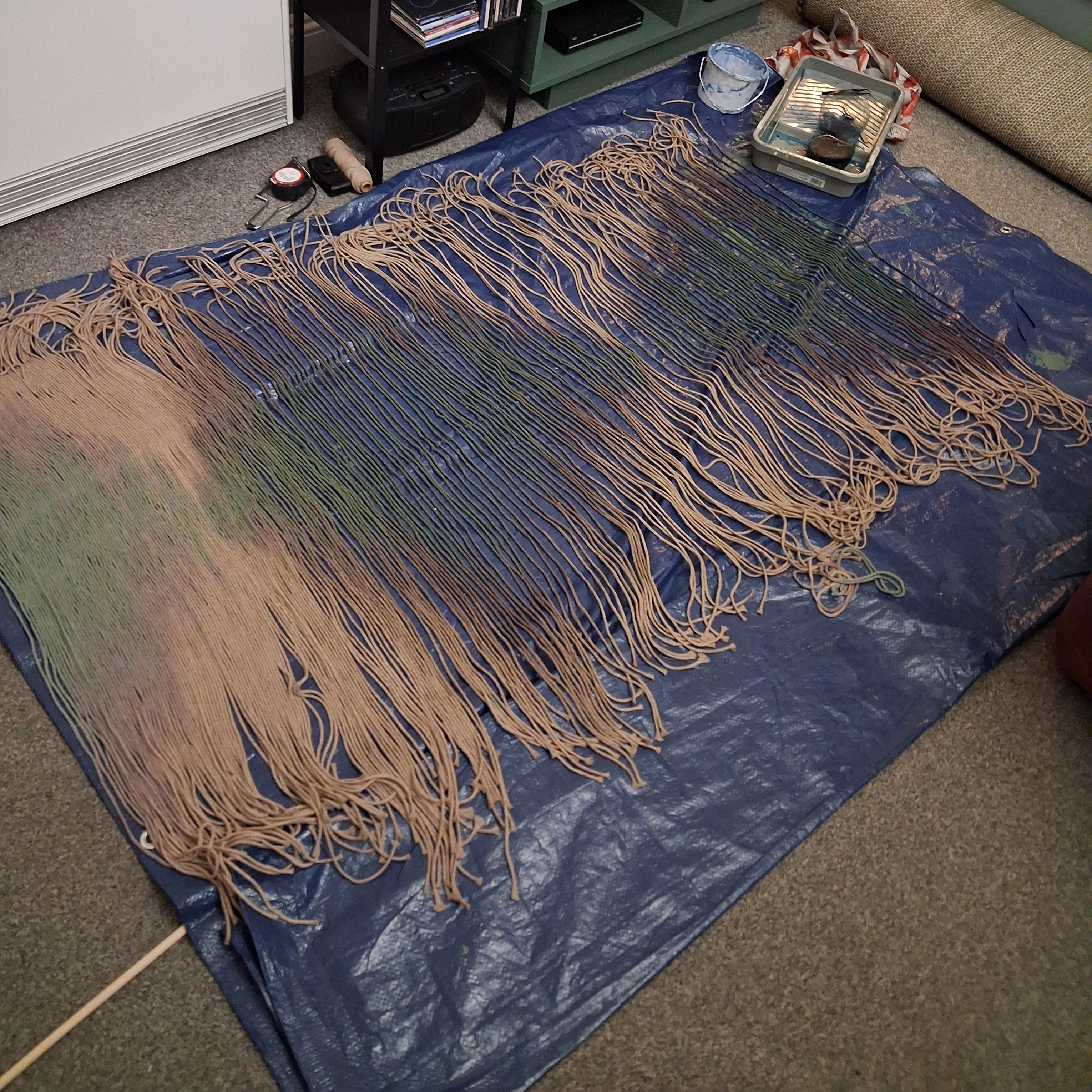 The dimensions and aspect ratio were eyeballed by holding a tape measure to the wall. Cotton threads were cut to length and laid together so I could outline the shape and colour boundaries with a fabric pen. Each thread was presoaked in water, gripped with tweezers and dipped in Dylon Jeans Blue. They were carefully folded to dye the edges with Dylon Ocean Blue before laying to dry overnight. The process took around 3 hours and the colours (thankfully) dried a different shade.