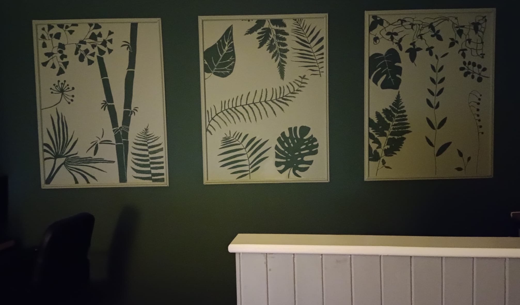 I imported some botanical PNG silhouettes into Microsoft Powerpoint and arranged them virtually within my panels. After overlaying a grid - the same way my dad taught me to draw pencil portraits as a child - I grabbed my ladders and got to work.