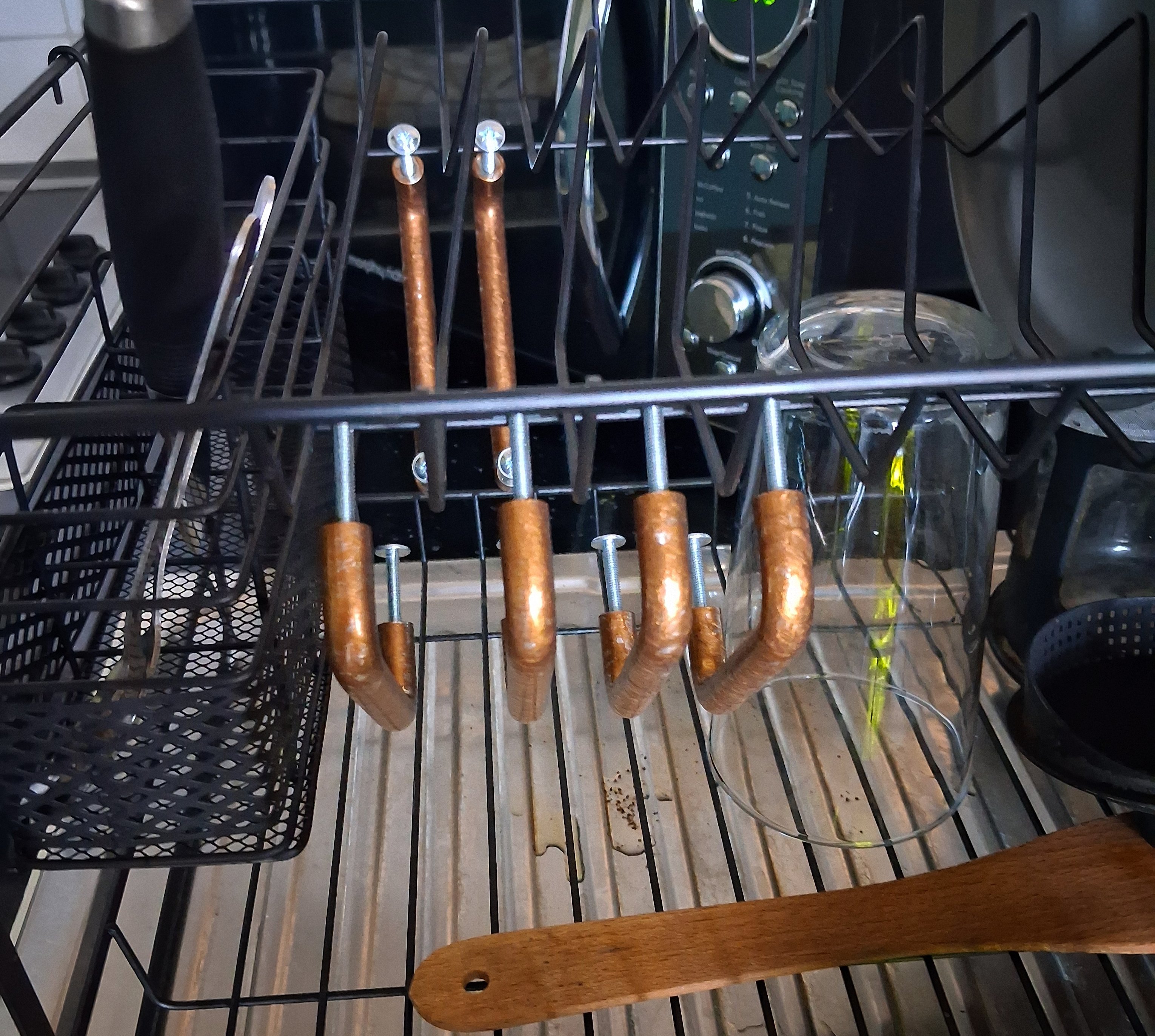 Copper handles are expensive and I couldn't find the right style so bought a few twin packs of D-shaped nickel-effect handles for £3 each from B&Q. I painted them with Painter's Touch Penny Bronze. The first layer was difficult but - after airing on my ingeniously improvised drying rack - the second coat adhered well... and I suspect this may have gently reignited my desire for scale model making.