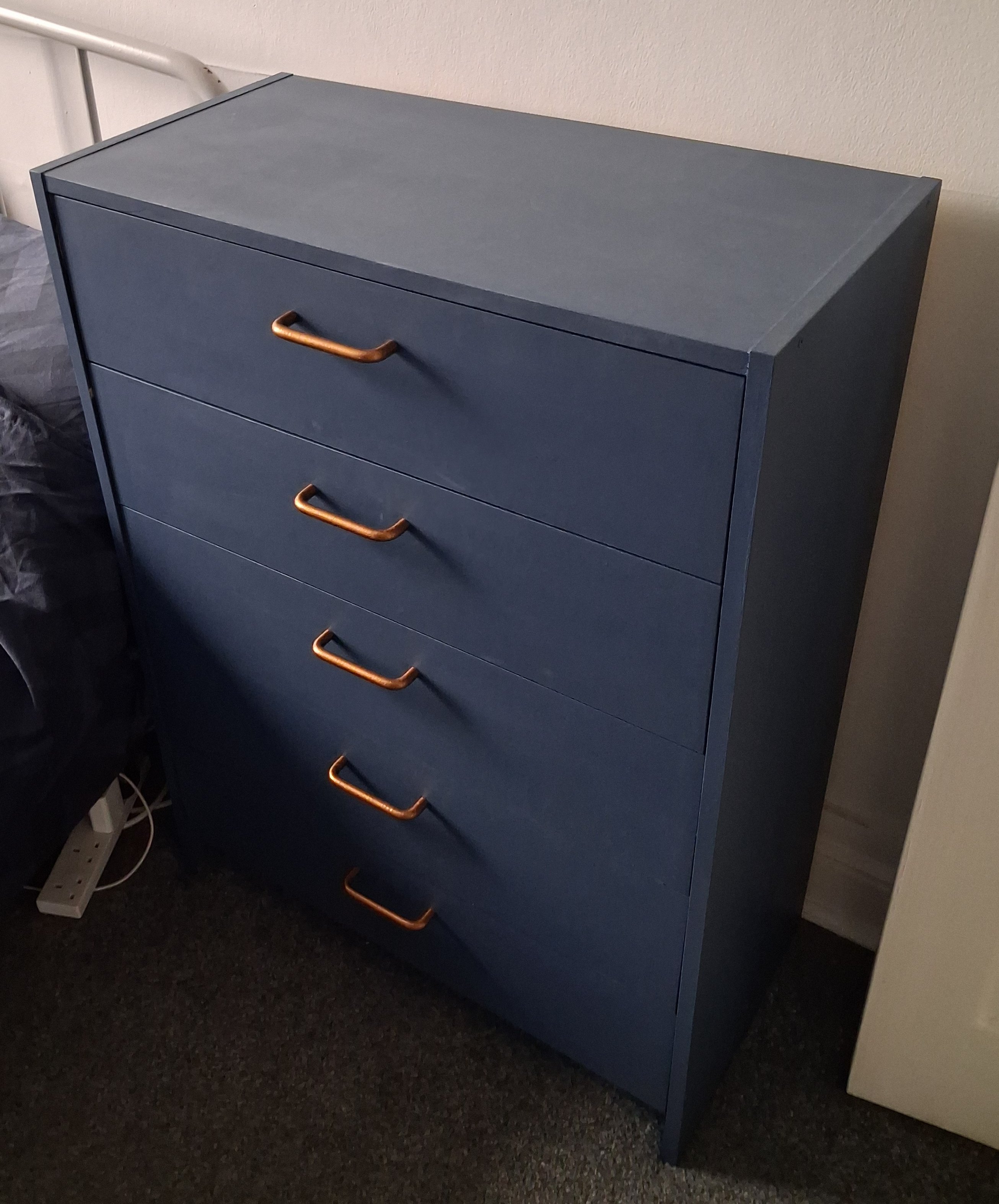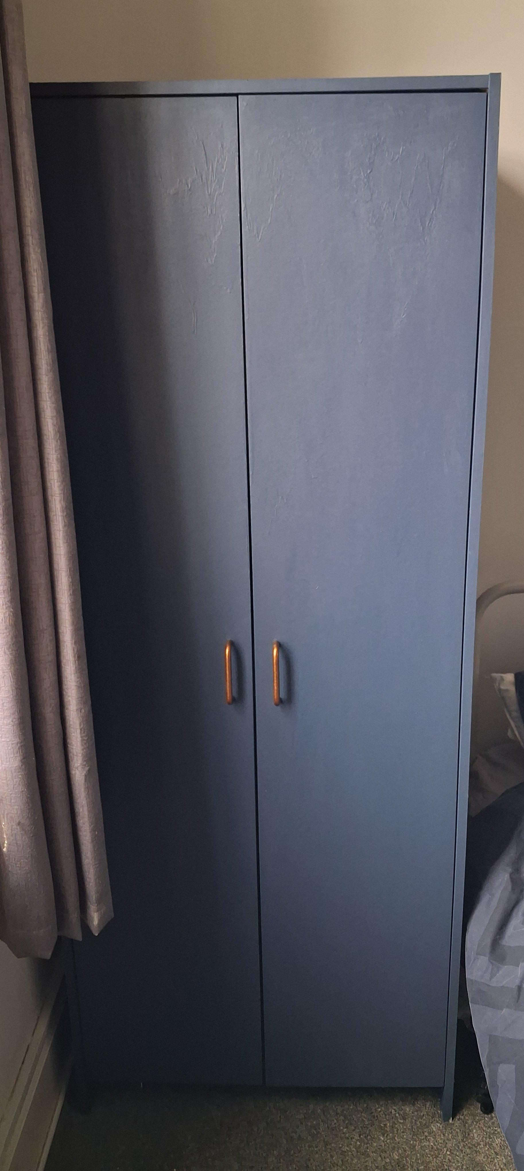I sanded the veneer panels by hand and recoated them with Rust-Oleum Ink Blue furniture paint. Unfortunately, I applied the second coat while the first was still sticky and suffered terrible drip marks on the wardrobe. It could be corrected with a quick sand and mild patience but it's only visible in strong light and otherwise just resembles wooden knots.
